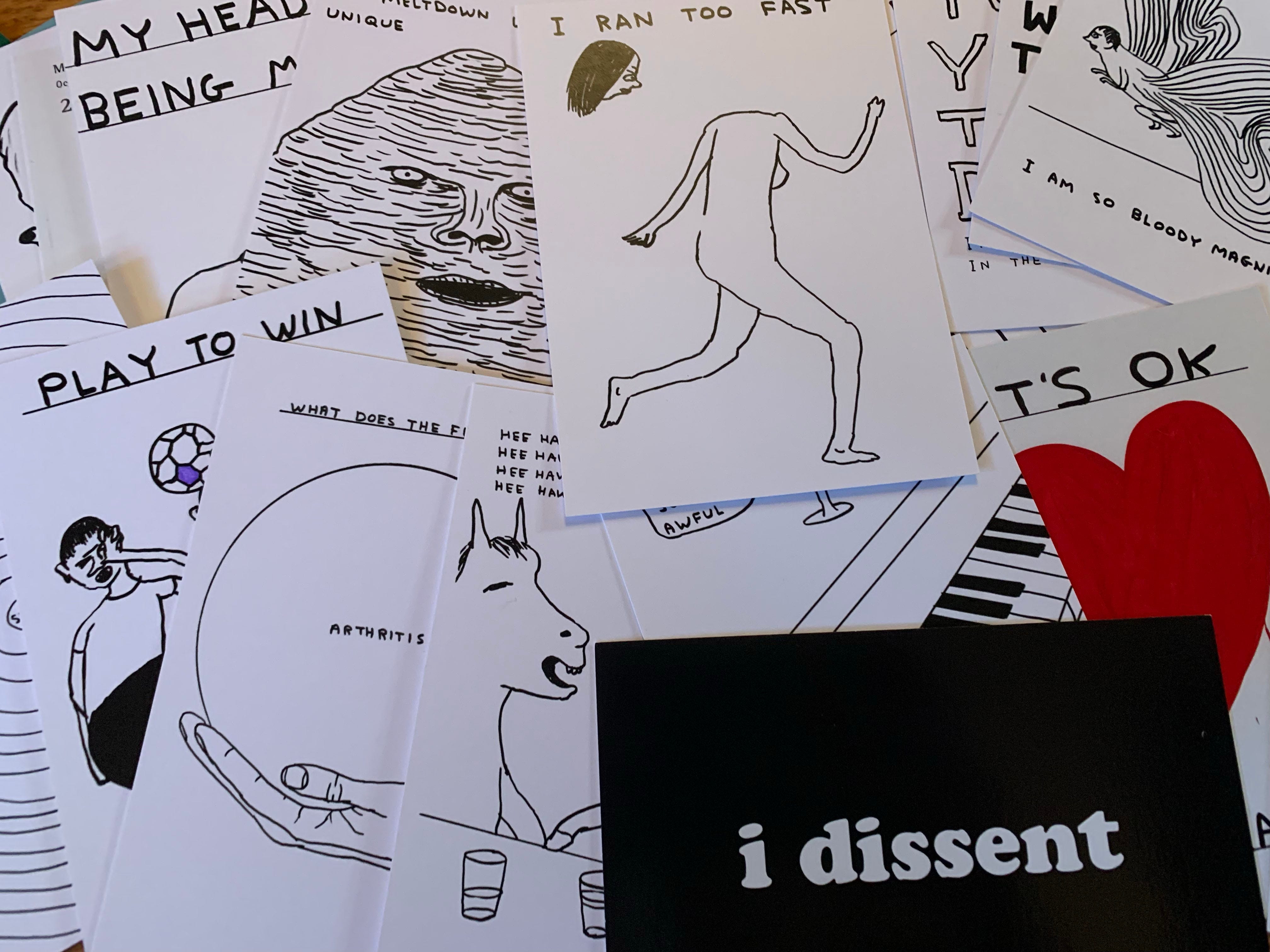 → David Shrigley’s art just sends me (some of his postcards are in the photo up top)