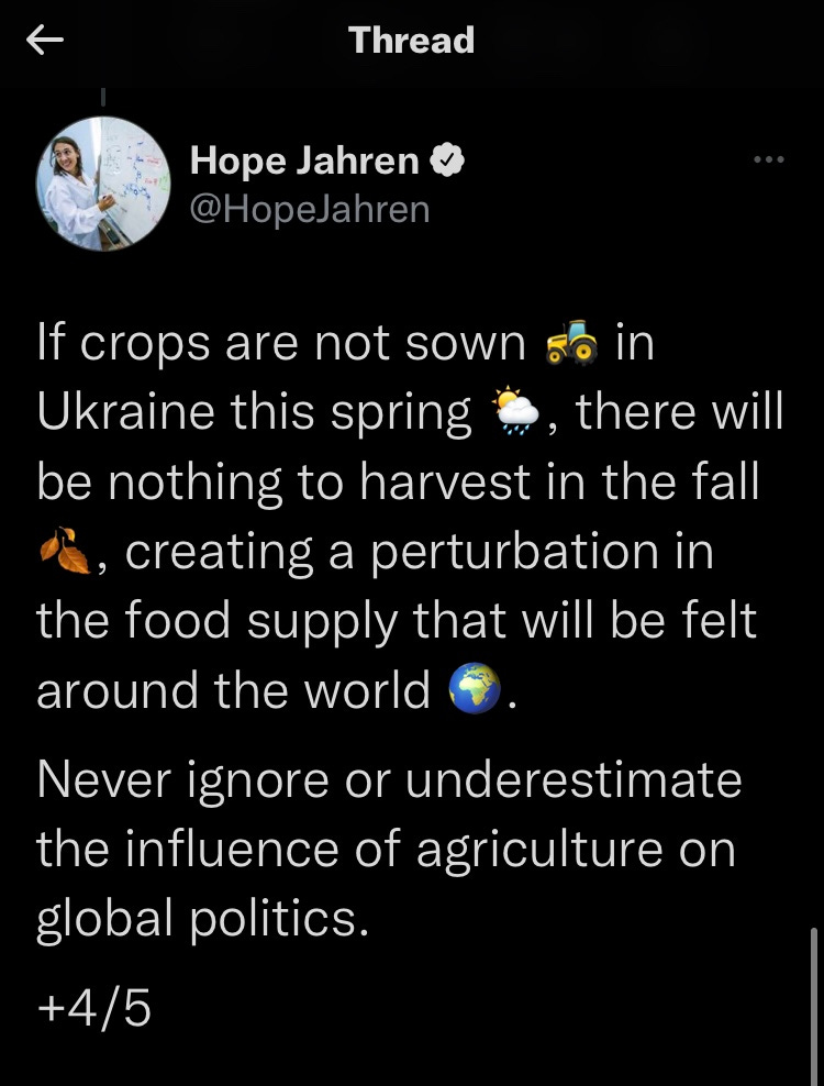 This all feels very navel-gazey while the terrifying invasion of and war in Ukraine worsens (there’s a sentence, sheesh). I also know this work of nudging tiny self-reliances is important. The war in Ukraine is very close to home in at least one respect, wherever home is. From scientist/writer Hope Jahren last week, via Twitter: